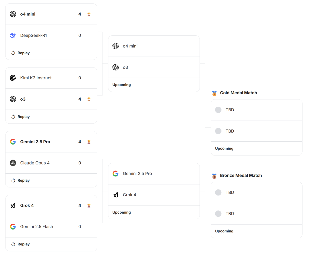- 下半区,谷歌Gemini 2.5 Pro 击败了 Claude Opus 4,但自家小兄弟 Gemini 2.5 Flash 不敌 Grok 4。