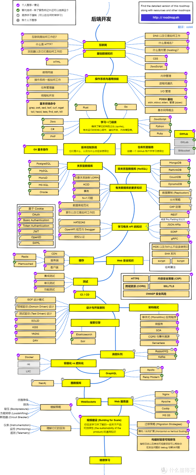 - 展示一下专业码农的路线图,英文原版图谱:前端知识图谱,后端知识图谱: