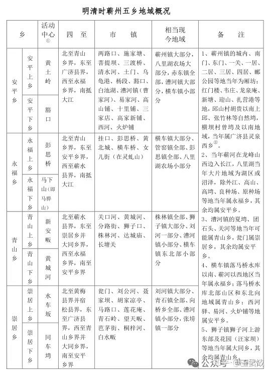 明洪武九年(公元1376年),撤蕲春县,由蕲州直辖原县境。除州城及近郊外,乡村划分为安平、永福、青山、崇居、大同五乡,每乡再分上、下,共十乡。此格局一直延续至清末。