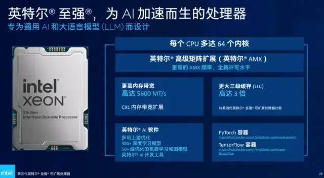 - 与相同内置AI加速技术(AMX,高级矩阵扩展)的前一代(第四代至强® 可扩展处理器)相比,深度学习实时推理性能提升高达42%;
