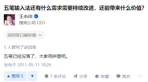 - 2011年5月11日,王小川在知乎发帖:五笔已经没落了,大家改用拼音吧