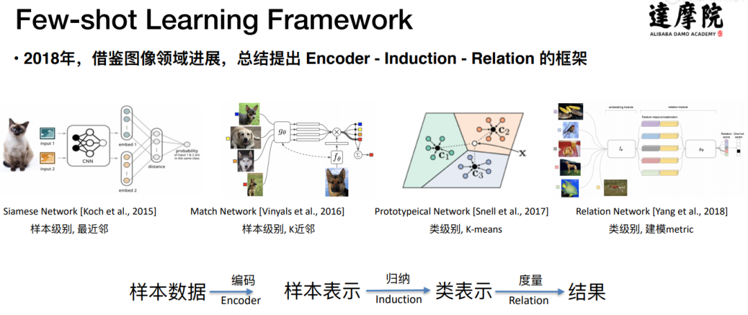 - 基于目前 Metric Based 方法,提出了 Encoder-Induction-Relation 的三级框架,如图 10 所示,Encoder 模块用于获取每个样本的语义表示,可以使用典型的 CNN、LSTM、Transformer 等结构,Induction 模块用于从支撑集的样本语义中归纳出类别特征,Relation 模块用于度量 query 和类别之间的语义关系,进而完成分类。