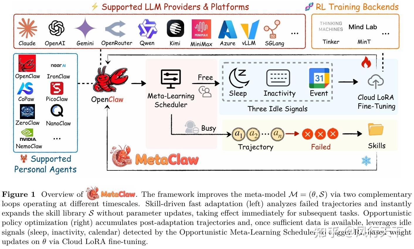 - 【2026-3-17】CMU+伯克利 推出持续元学习框架MetaClaw,联合维护基础 LLM 策略和不断演变的、包含可重用行为指令的技能库,实现 agent 自我进化