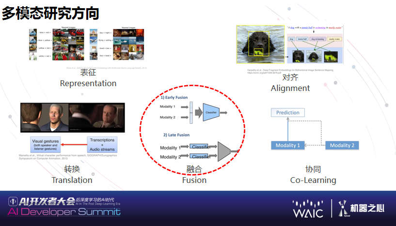 表征,多个模态联合去做事物或者语义的联合表征;转换,在模态之间实现转换,例如输入文字出现画面,输入声音出现文字;融合,在做单模态识别之后做后端融合,把整个模态在分类阶段、工作阶段加以融合;对齐,比如一段文字、一个视频,怎么把其中物体和关系做对应;此外还包括模态之间的协同。- img